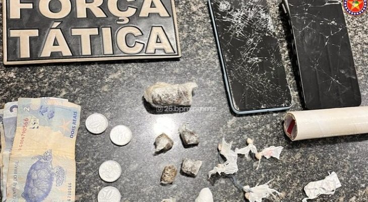 A guarnição realizou o cerco nas imediações e localizou o suspeito. Durante a abordagem, foram encontradas porções de substância análoga à maconha, e o indivíduo confessou comercializar entorpecentes na residência. Nas buscas realizadas no imóvel, também foram localizadas porções de substância análoga a crack, além de materiais utilizados para o fracionamento e acondicionamento das drogas.