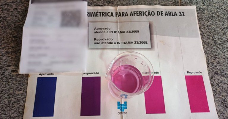Diante disso, foi retirada na presença do condutor uma amostra de 50ml do tanque de Arla 32, a qual foi submetida ao teste com um reagente específico (reagente Negro de Eriocromo-T).