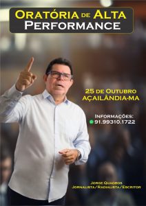 Você nem imagina quantas pessoas perdem oportunidades de emprego, de se destacar em sala de aula, de ministrar uma palestra e até de pregar a Palavra de Deus por causa do medo de falar em público. A falta de conhecimentos técnicos de oratória é capaz de promover ‘para baixo’ quem tem essas dificuldades. Os especialistas afirmam categoricamente que falar bem em público não é dom, é técnica. E é verdade. A repetição leva à perfeição e quanto mais você treina, mas você fica bom naquilo que se arvora fazer. Falar em público não pode ser por impulso. Tem que ter conhecimento. O Curso Oratória de Alta Performance será no dia 25 de outubro, no auditório da Associação Comercial e Industrial de Açailândia sob a coordenação do jornalista, escritor e radialista Jorge Quadros que tem quase trinta anos de experiência em ministração de curso de oratória.