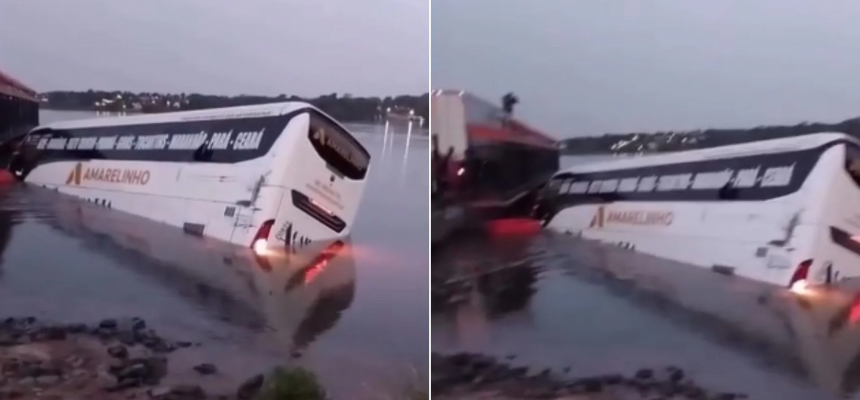 Um ônibus de turismo caiu dentro do Rio Tocantins no início da noite dessa segunda-feira (15), ao tentar acessar a balsa que faz a travessia entre Aguiarnópolis, no Tocantins, e Estreito, no Maranhão.